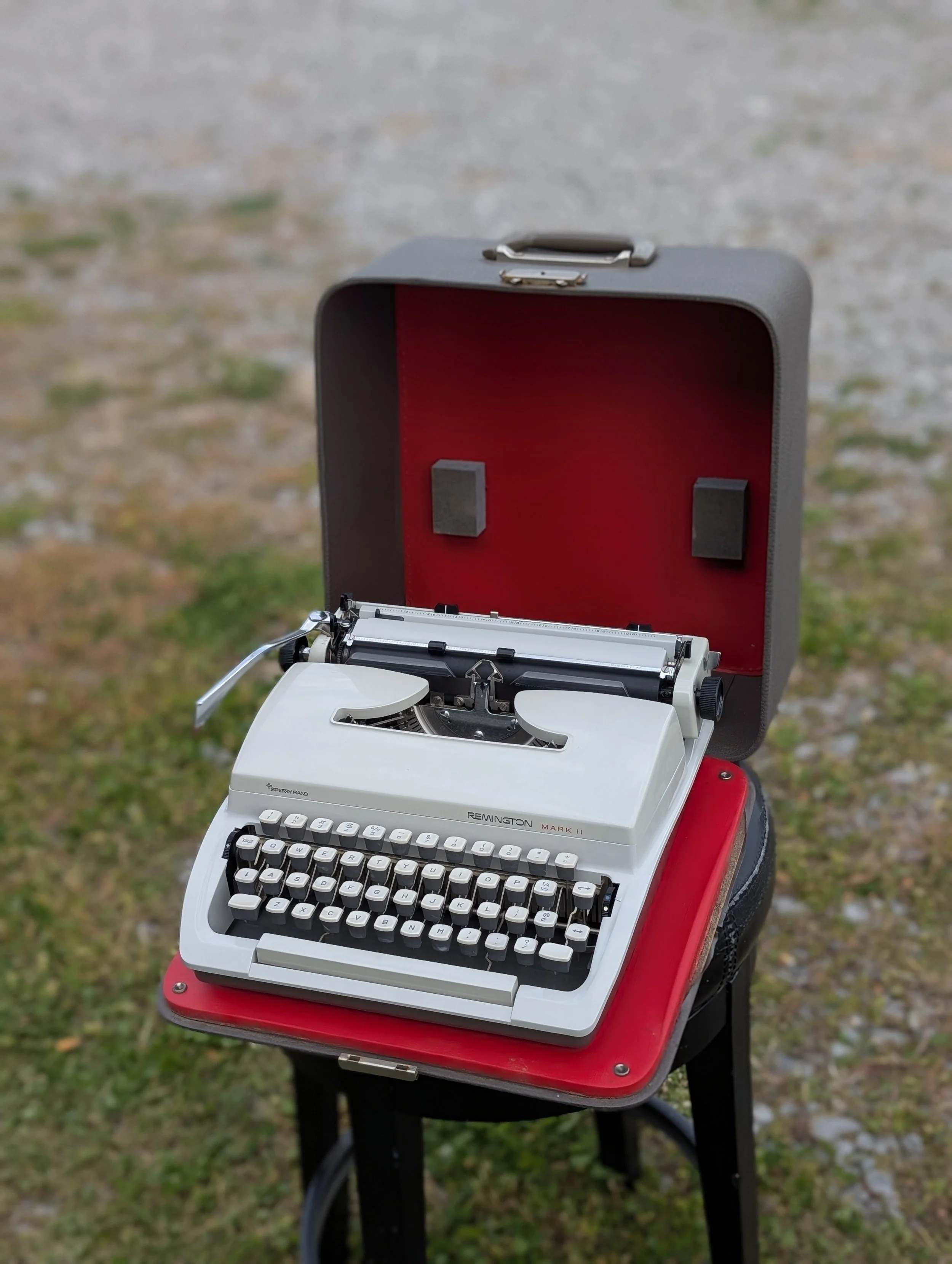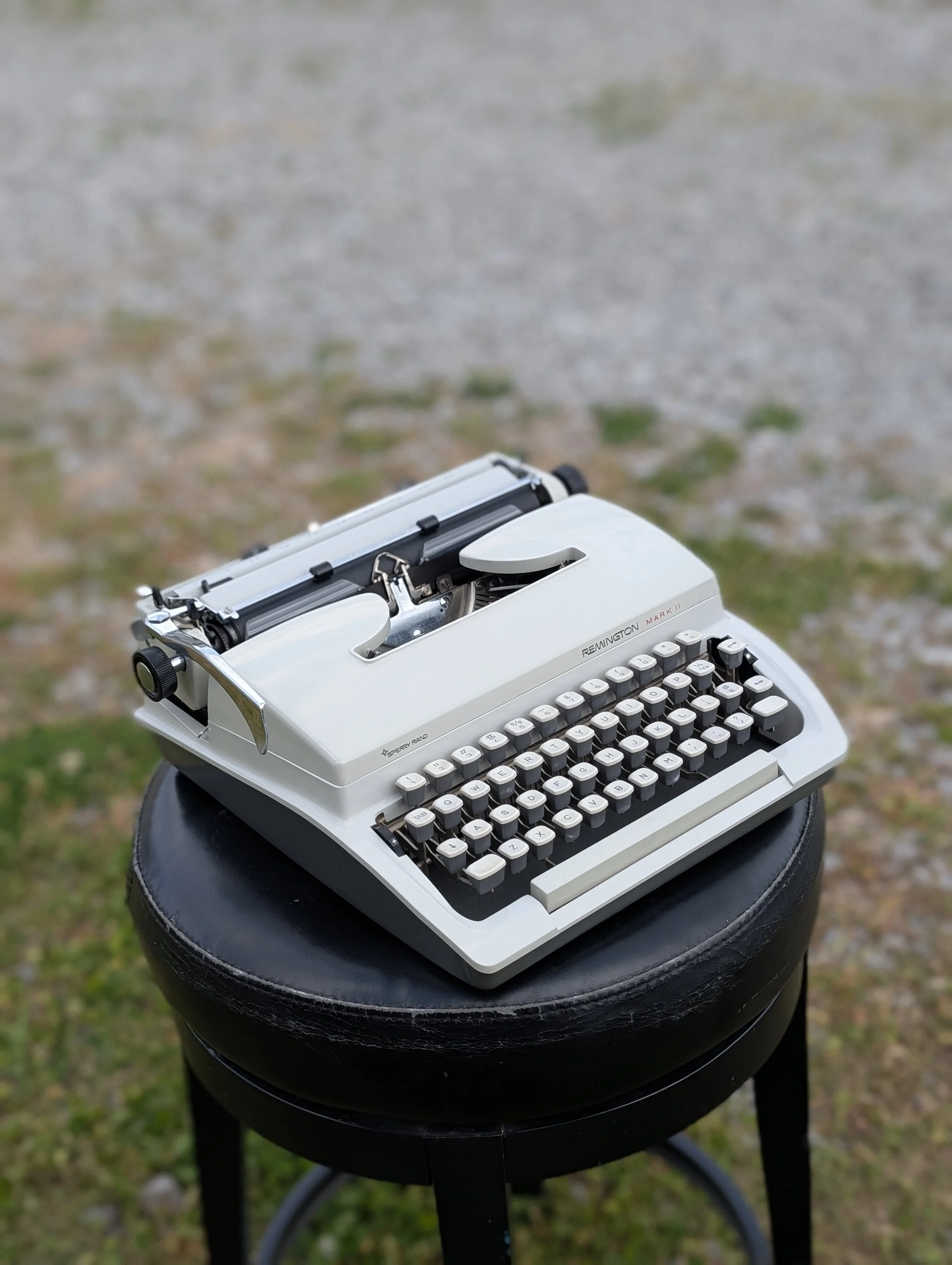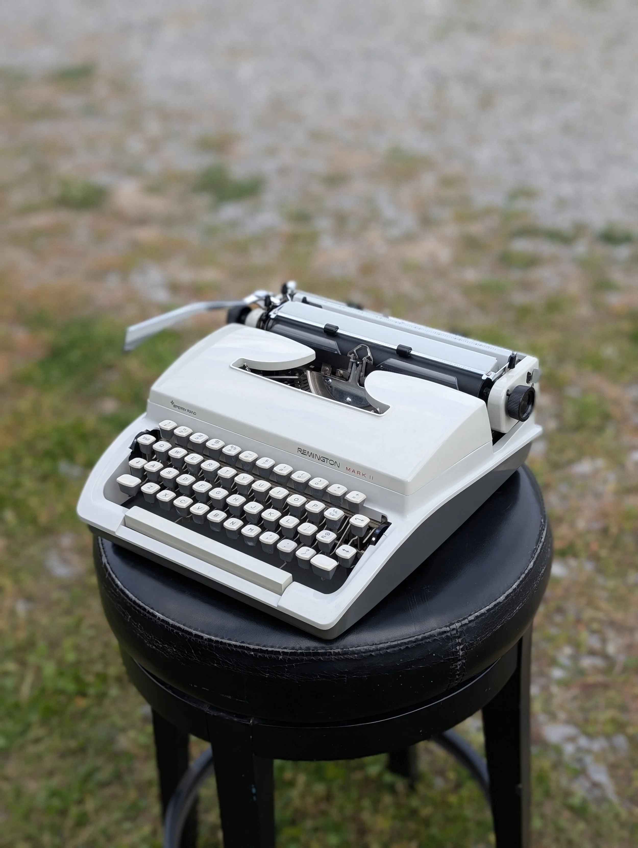 A brand spankin' new solid black or bichrome red/black ribbon on vintage Remington spools(installed), a reprinted original owners manual, the typewriter & case, an OFFICIAL Nashville Typewriter sticker and hand-typed note from me, the typeface text sample, and even a few sheets of paper to get you started on the path to analog independence and distraction free writing!