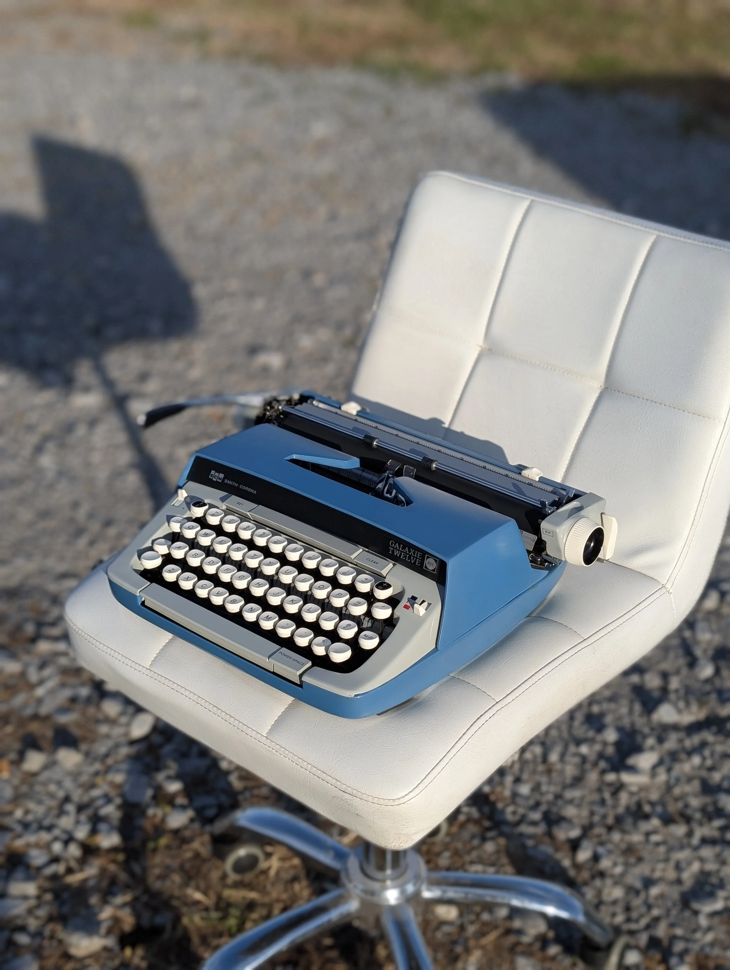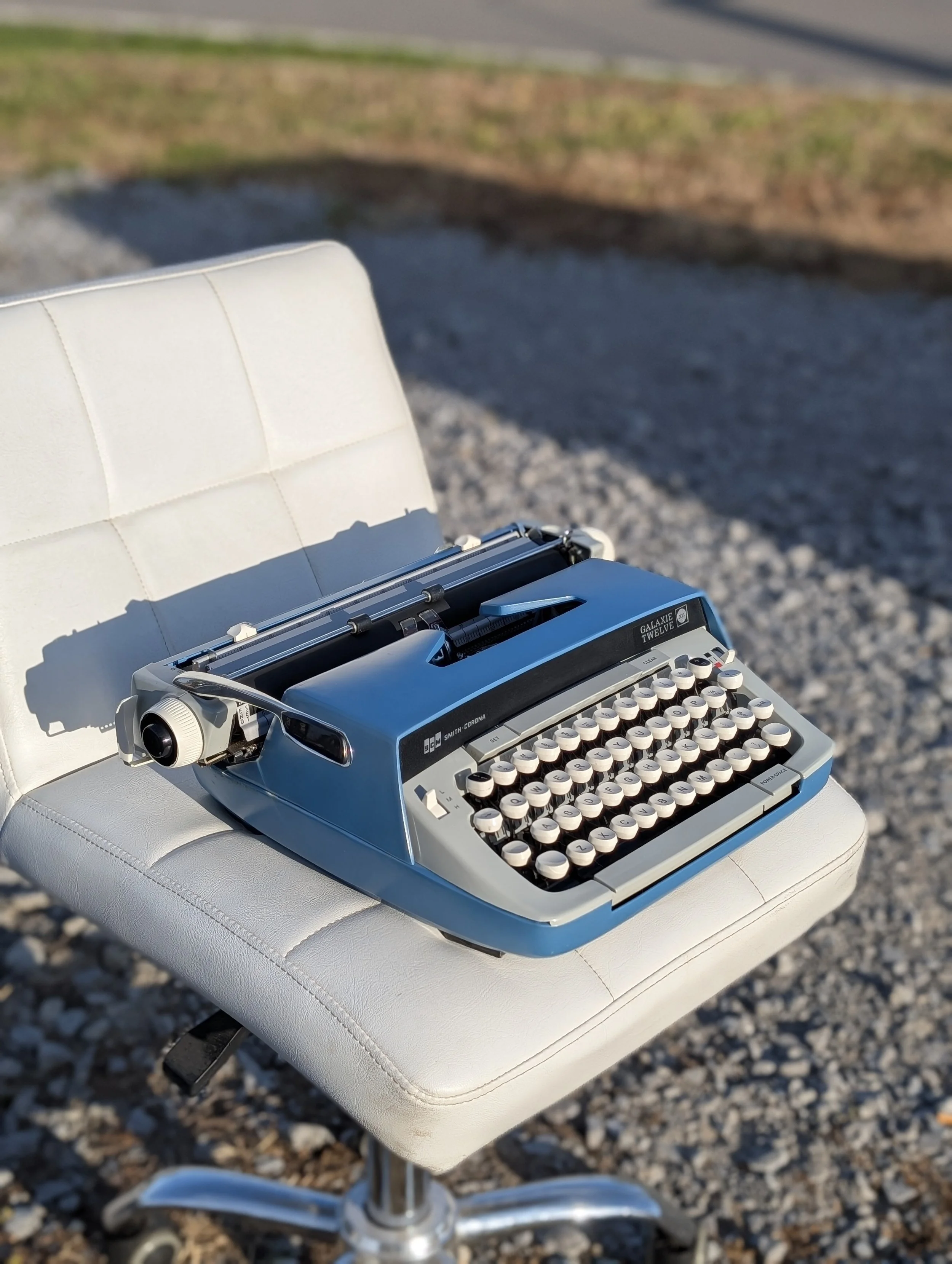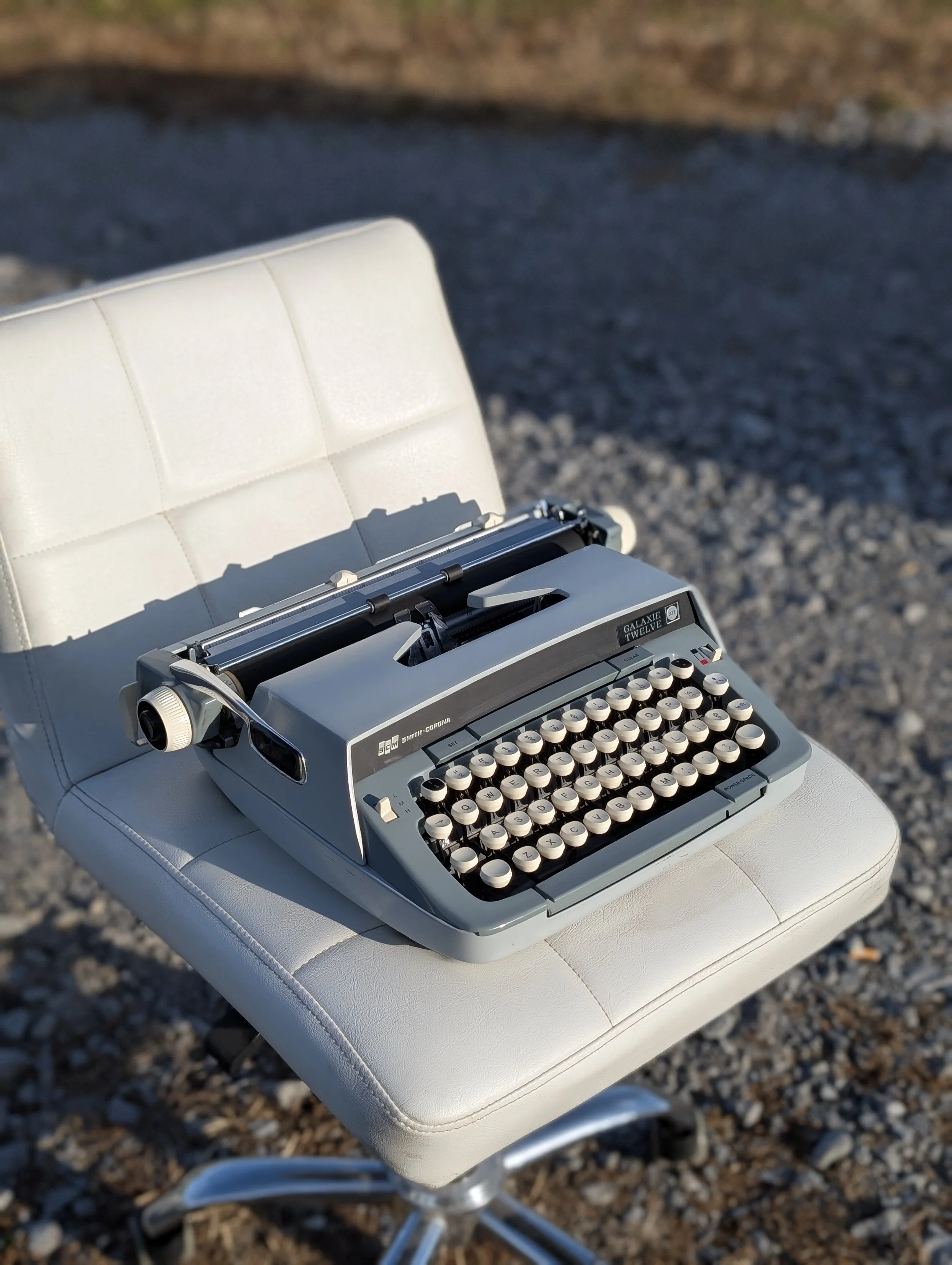 Considered by many to be the pinnacle of SCM portables, the Galaxie 12 is the top of the line portable Typewriter sold by Smith Corona in the late 60’s to 70’s. This one is in virtually mint condition. The paint, plastic, and mechanics all as nice as the day it was purchased in 1973. The pica typeface is professional, crisp, and easy to read at 10 characters per inch..